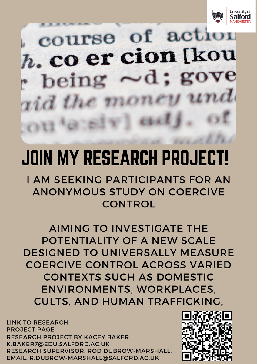 I am a researcher from The University of Salford conducting a study titled Investigating the potentiality of an “Extent of Coercive Control Universal Scale” – an exploratory study as part of my master’s programme dissertation in the Psychology of Coercive Control (supervised by Dr Rod Dubrow-Marshall).